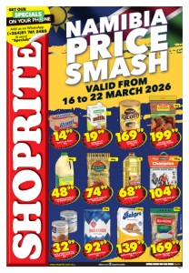 NAMIBIA PRICE SMASH VALID FROM 16 to 22 MARCH 2026 Page 1 ENGLISH www.shoprite.com.na shopritenamibia follow us on NAFOSRDTTU_E 1499 ROMI 37% FAT SPREAD 500g 19999 REALGOOD CHICKEN FROZEN MIXED PORTIONS 4kg 4kg 10kg 16999 RICE KING LONG GRAIN PARBOILED RICE 10kg 5kg 9299 MARATHON WHITE SUGAR 5kg 4899 OSHIKANDELA CULTURED MILK ALL VARIANTS 2kg EACH 2kg 1l 1999 BONNITA LONG LIFE FULL CREAM MILK 1l 3kg 7499 POLANA ELBOWS/MACARONI PASTA 3kg EACH 10kg 13999 BAKPRO VETKOEK WHEAT FLOUR 10kg 16999 NESCAFÉ RICOFFY INSTANT COFFEE 750g 10kg 10499 CHAMPION SUPER MAIZE MEAL 10kg 3299 CLOVER CONDENSED MILK 385g/ CARAMEL DAIRY DESSERT 360g EACH 2l 6899 NOLA SUNFLOWER OIL 2l